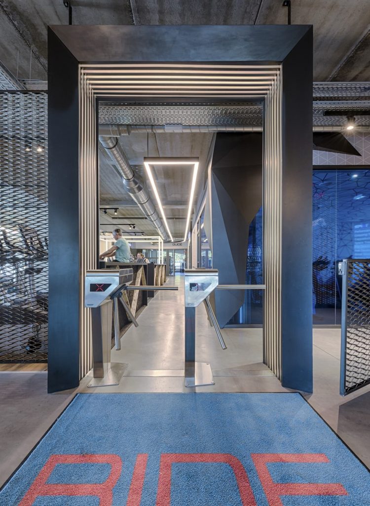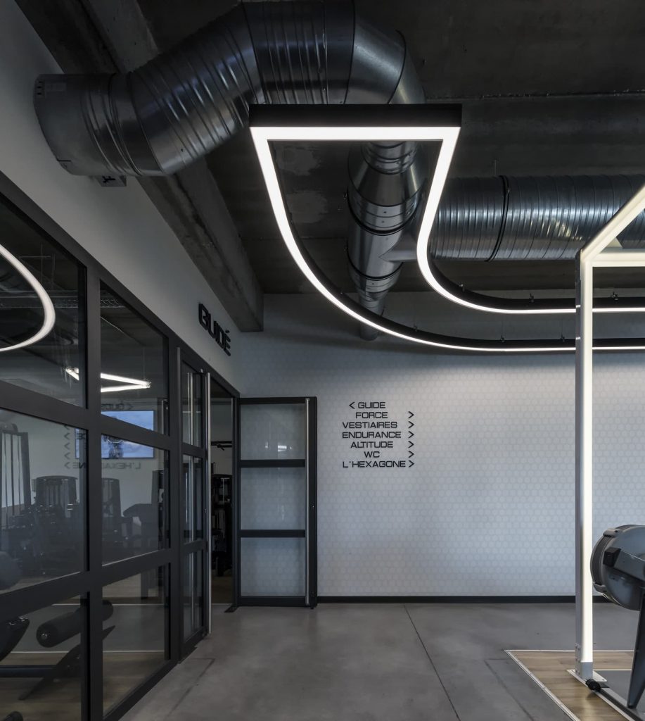 Lighting lines inspired by athletic lanes are suspended from the ceiling to mark the main circulation. The atmosphere is deliberately designed to be electrifying and motivating.