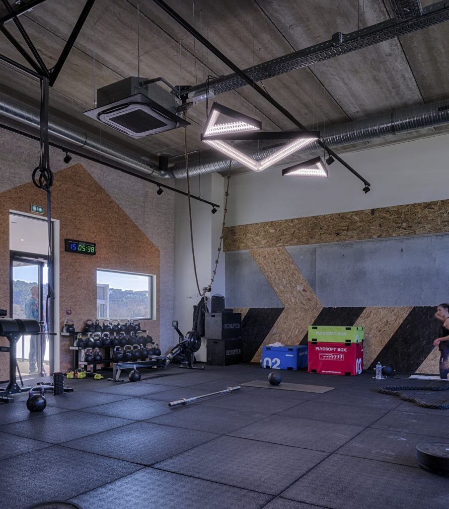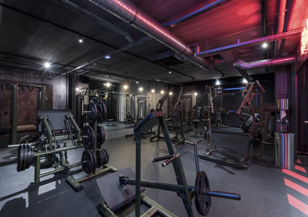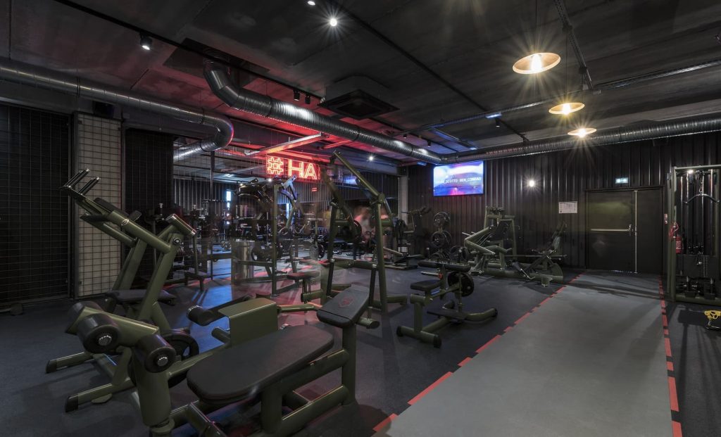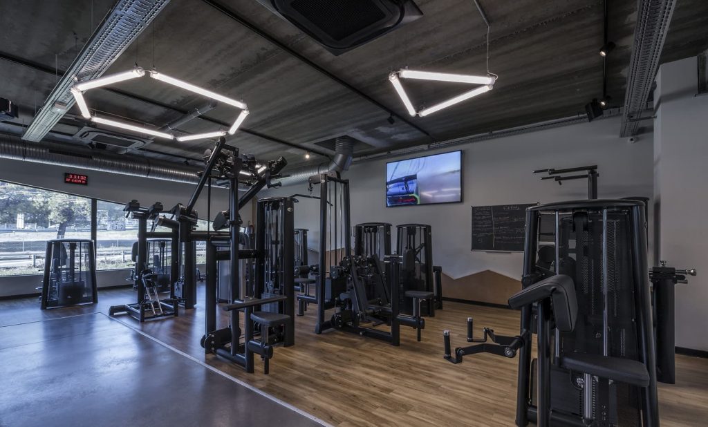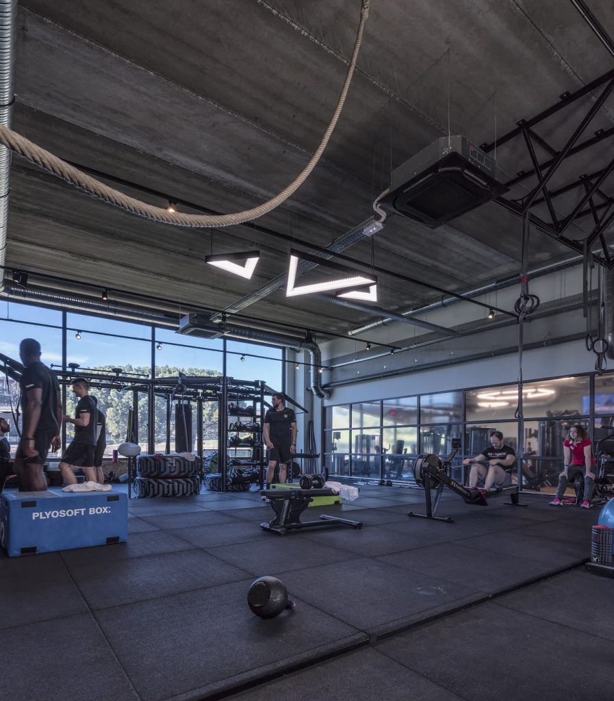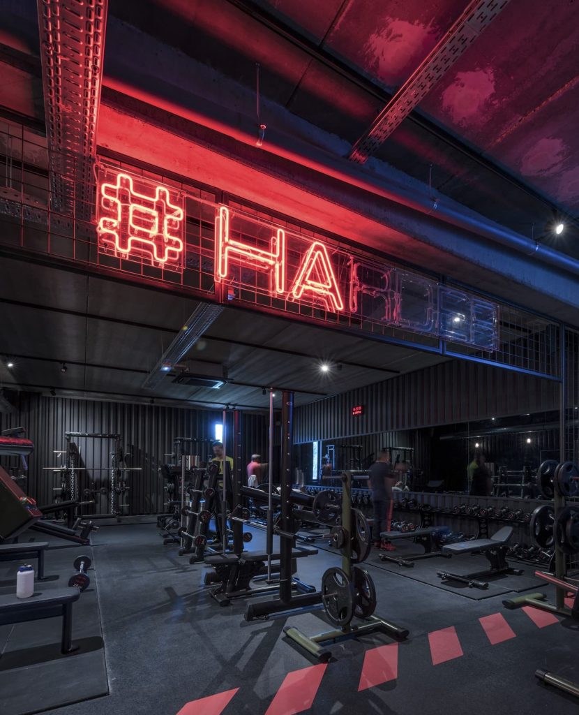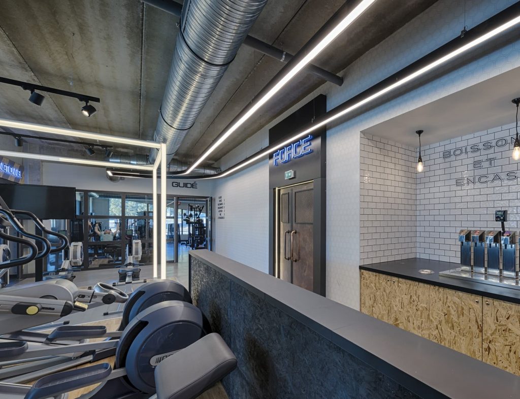 In the “Force” gym the atmosphere is dark, the materials and layout follow the codes of industrial or port areas. The lighting is focused on the machine.