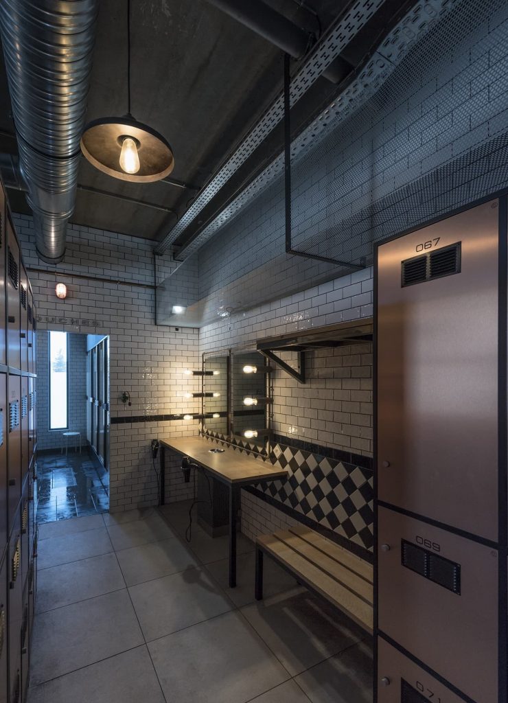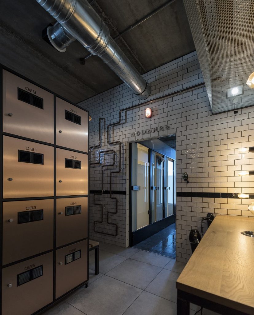 As for the changing rooms, it’s a leap back in time with a more vintage atmosphere inspired by the gyms of yesteryear. The copper tube is exposed and diverted as a towel dryer or light fixture while perforated photos of sports icons serve as claustras.