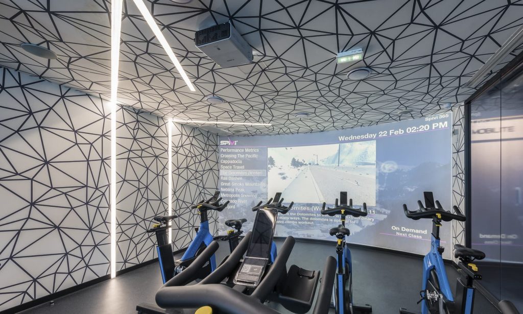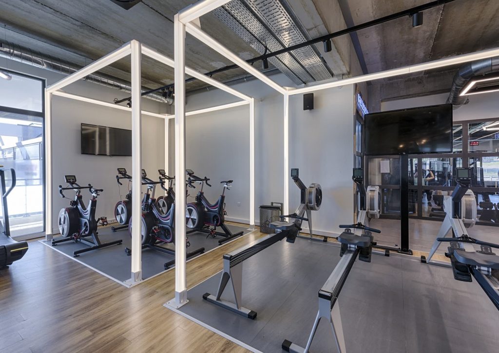 On the “Endurance” side, there are spaces where you can challenge your friends with connected bikes and rowers that take their place inside a playful cube shaped light frame.