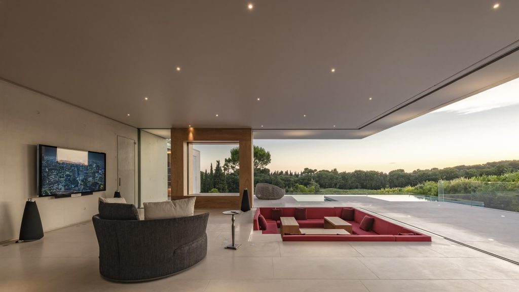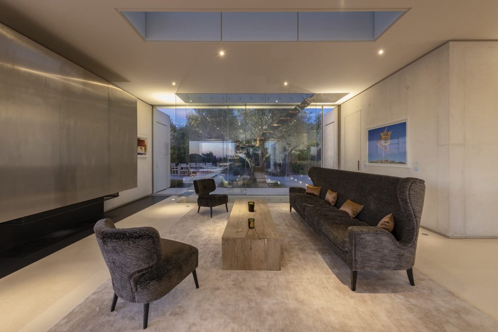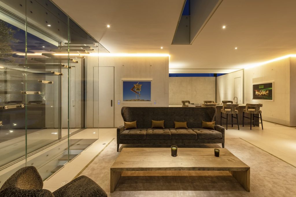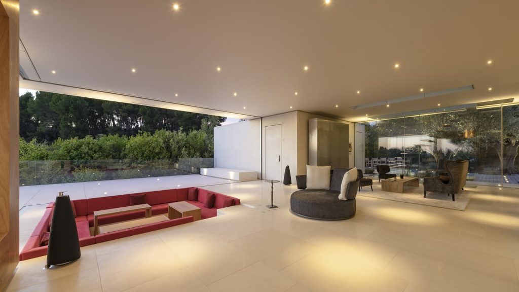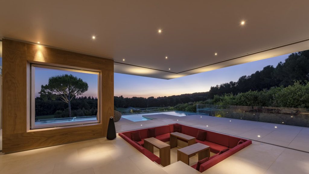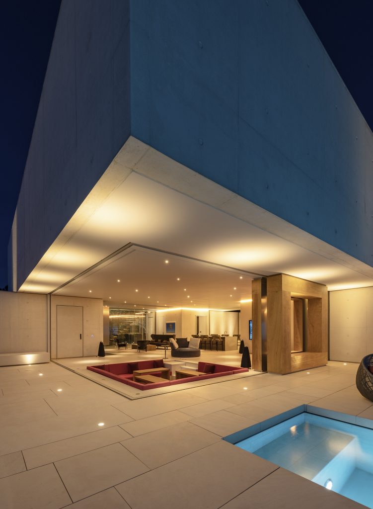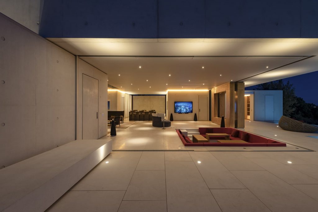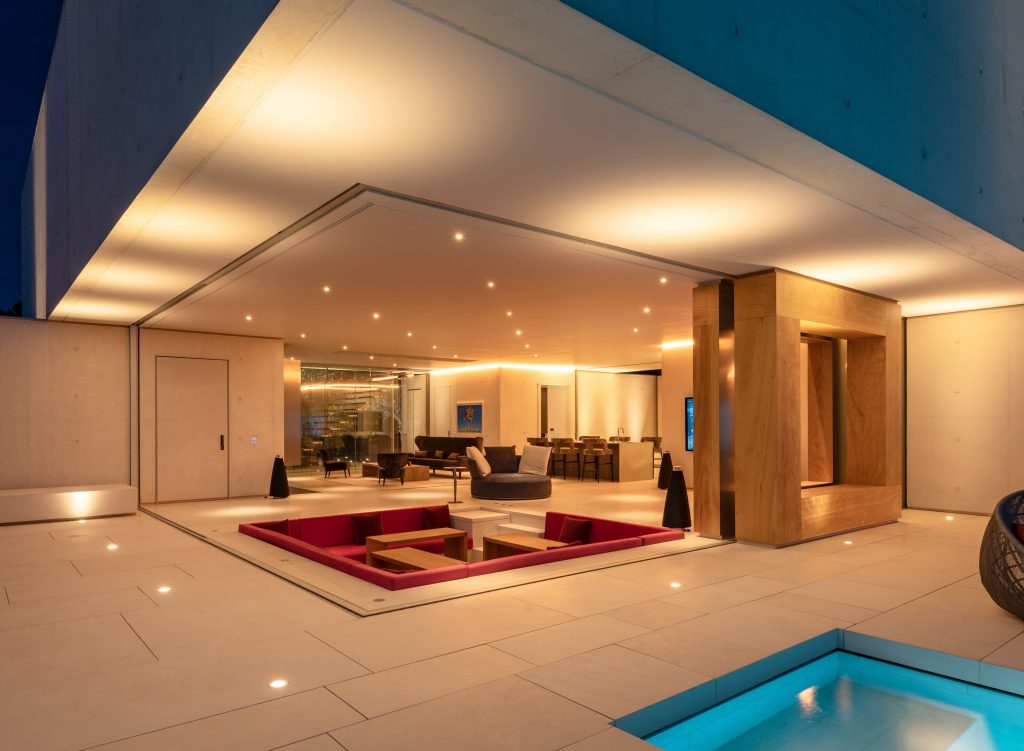 Pour le salon, ouvert sur l’extérieur, plusieurs spots furent intégrés au plafond afin de reproduire l’effet d’un ciel étoilé au-dessus de ses occupants. À cela s’ajoute un éclairage vertical haut et bas grâce aux luminaires insérés dans la terrasse.