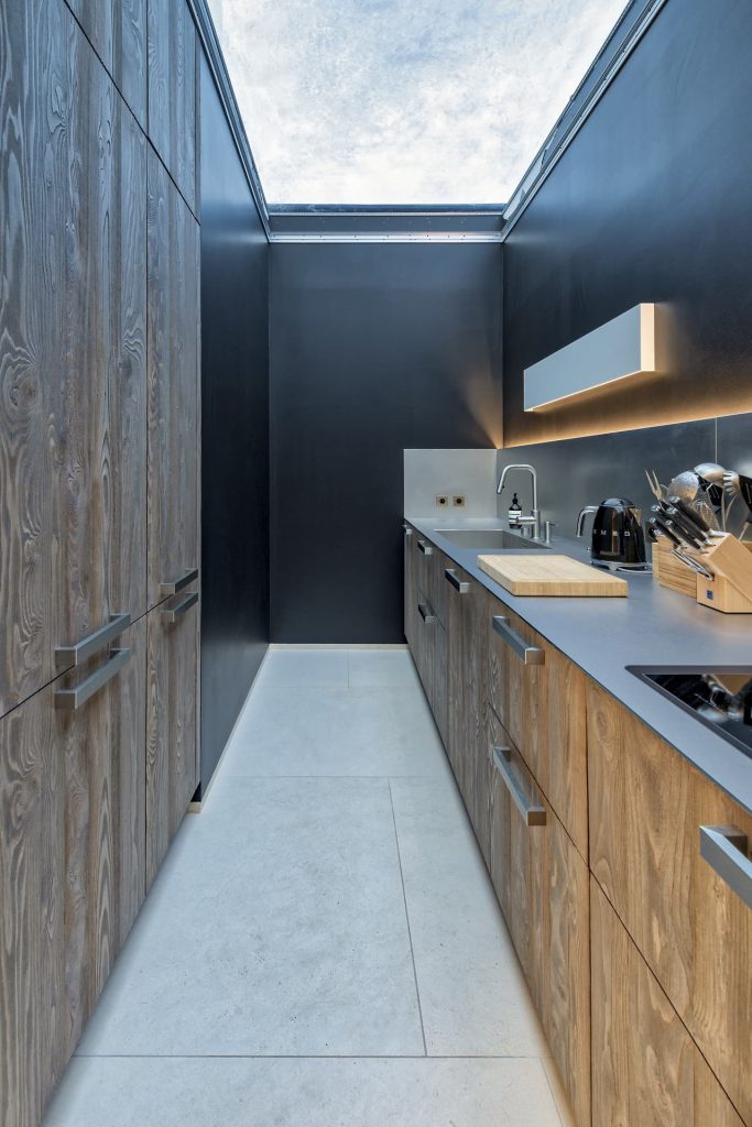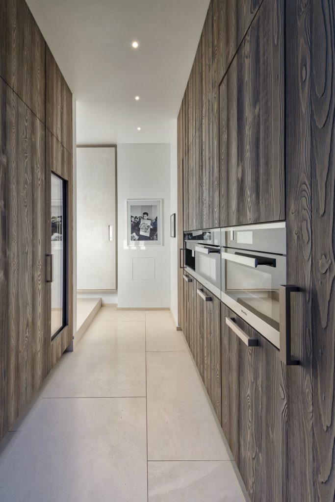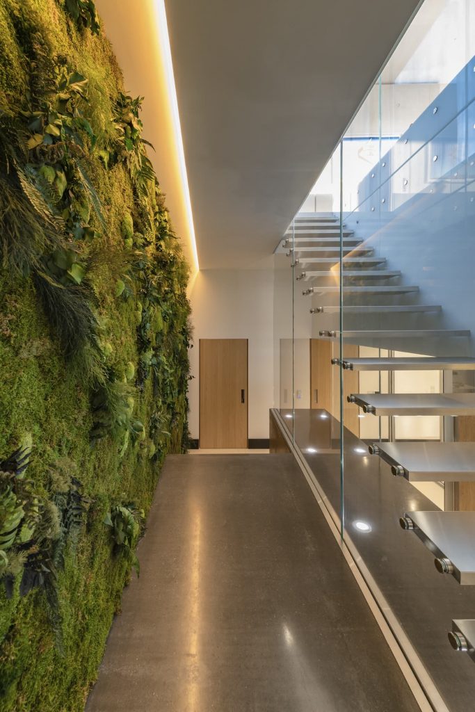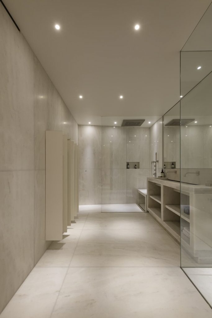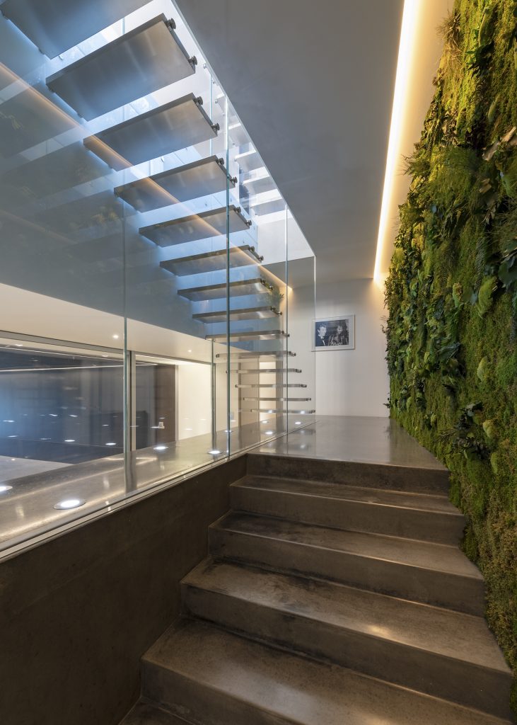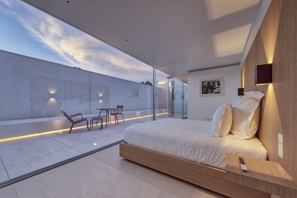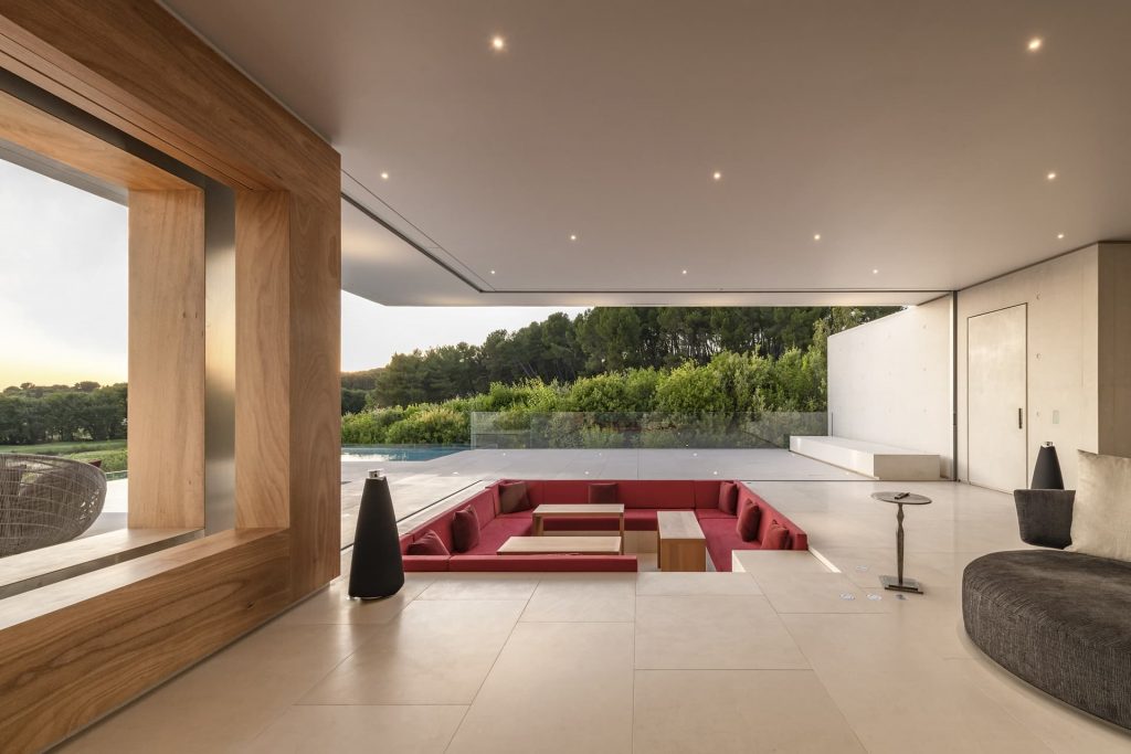 Pour le salon, ouvert sur l’extérieur, plusieurs spots furent intégrés au plafond afin de reproduire l’effet d’un ciel étoilé au-dessus de ses occupants. À cela s’ajoute un éclairage vertical haut et bas grâce aux luminaires insérés dans la terrasse.