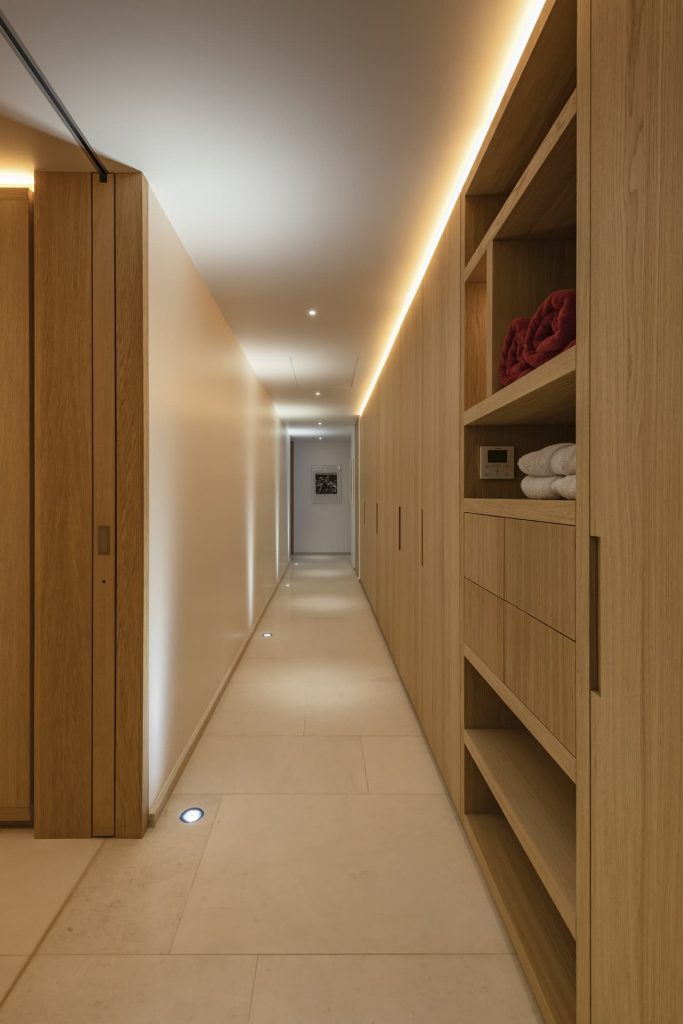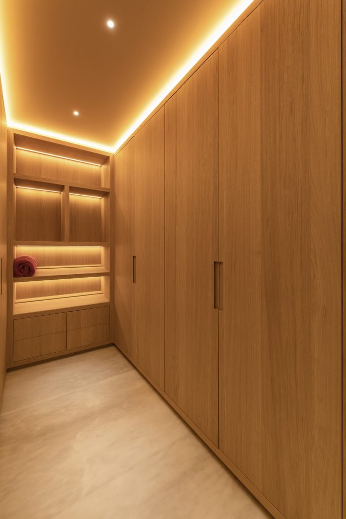 Dans l’optique de mettre en valeur les espaces et le béton, l’ensemble de cette villa aborde un éclairage ambré afin de réchauffer l’atmosphère générale. Toujours dans un esprit contemporain des gorges lumineuses associées à des spots sont utilisés dans le dressing.