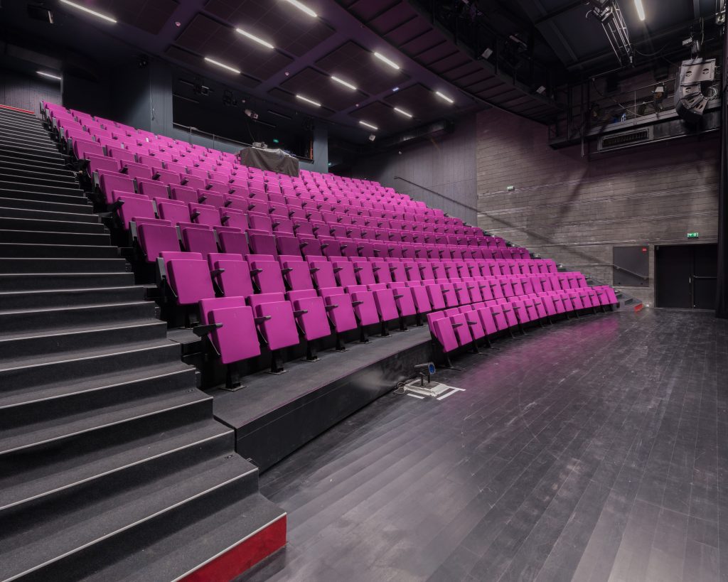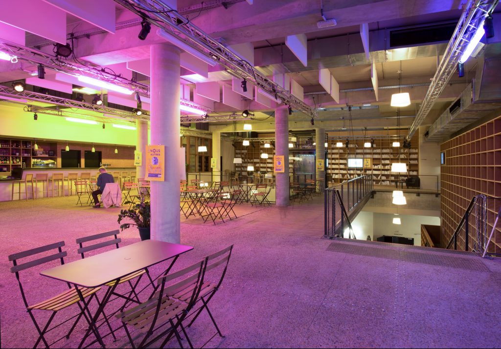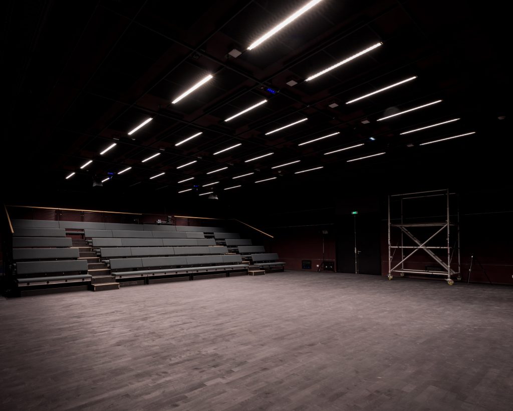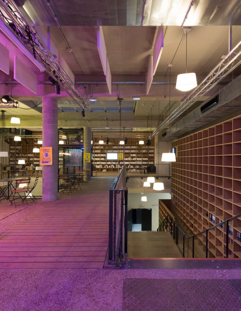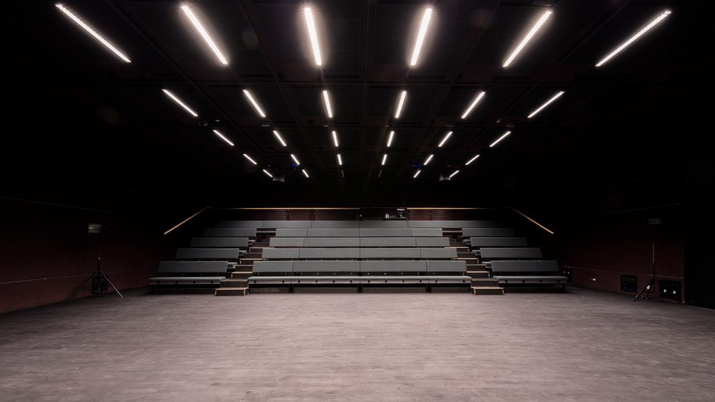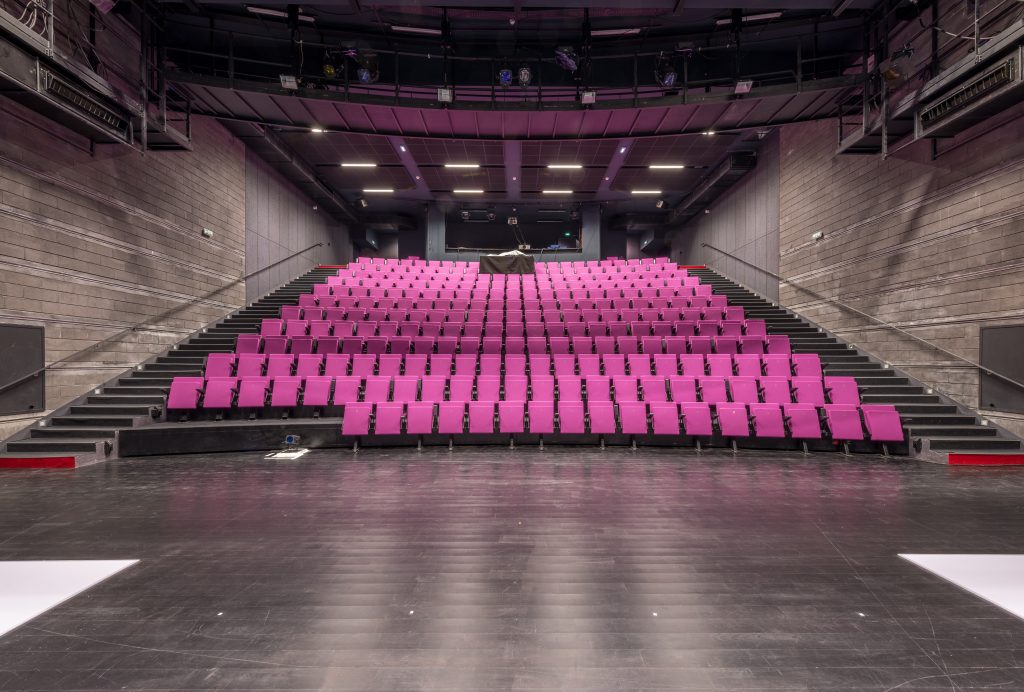 L’espace inférieur constitue l’espace théâtre comprenant, une grande salle de spectacle de 400 places, d’une petite salle de spectacle de 100 places, d’un studio de répétition de 100 m², de loges, d’ateliers décors et de locaux scéniques, le tout illuminé par des tubes LED.