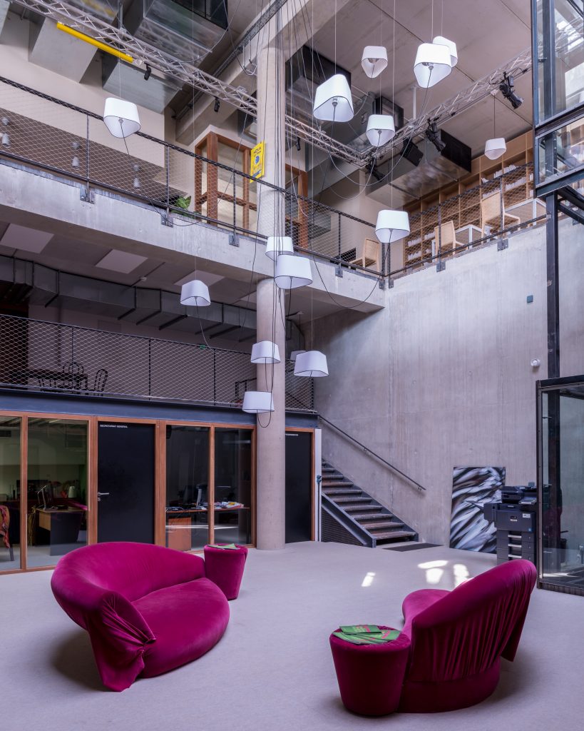 A l’intérieur, une grande pièce éclairée le jour par ces grandes baies et la nuit par des lignes lumineuses de plusieurs couleurs. Cette pièce est un espace d’accueil comprenant la réception, le bar et la bibliothèque ayant une capacité de 8 000 ouvrages. Au milieu de la pièce, une verrière faite de pavés de verre offre un puits de lumière naturelle décoré par une multitude de suspensions orientées de façon asymétrique.