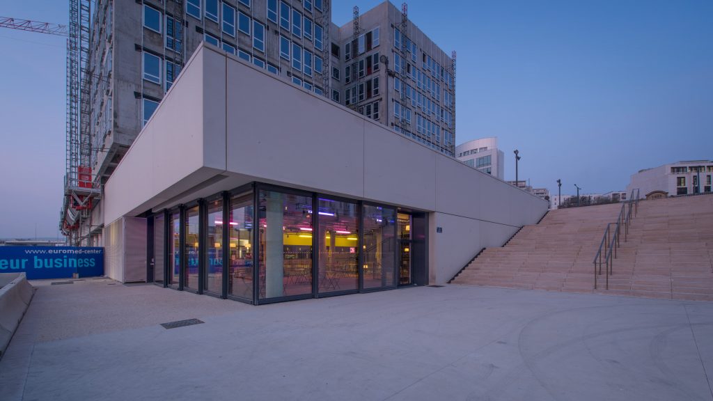 Le nouveau théâtre de la Joliette a été conçu par de jeunes architectes marseillais Nicolas Masson et Guillaume Beccaria qui ont réussi le pari d’offrir un lieu ouvert sur l’extérieur, connecté à l’espace public malgré son implantation à 80% souterraine.