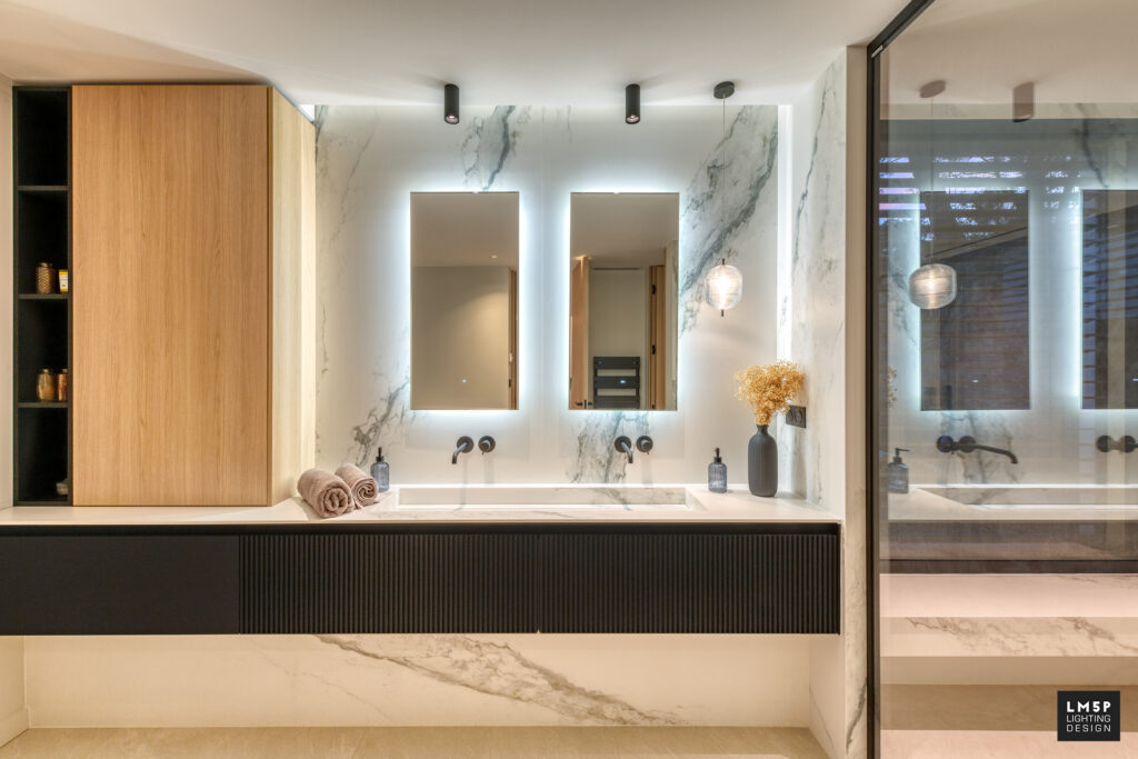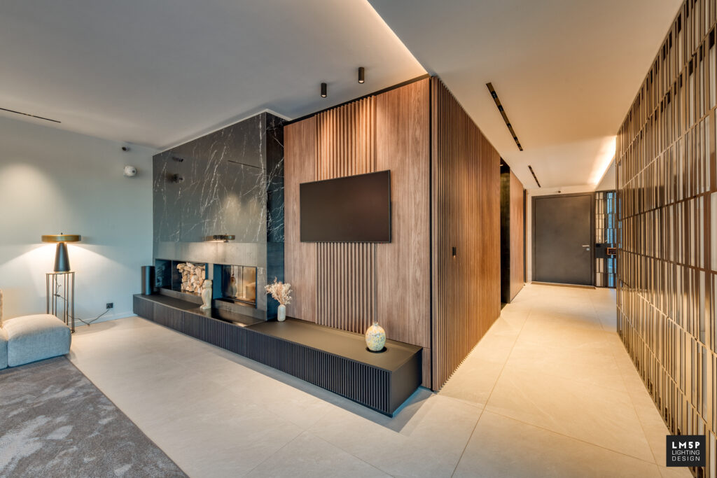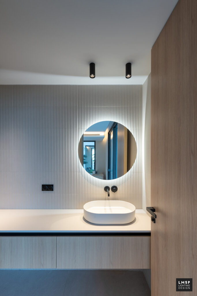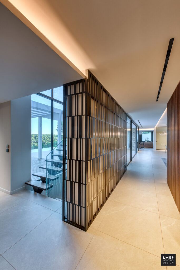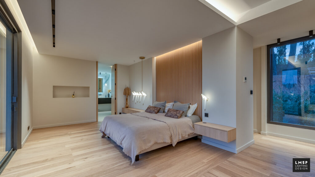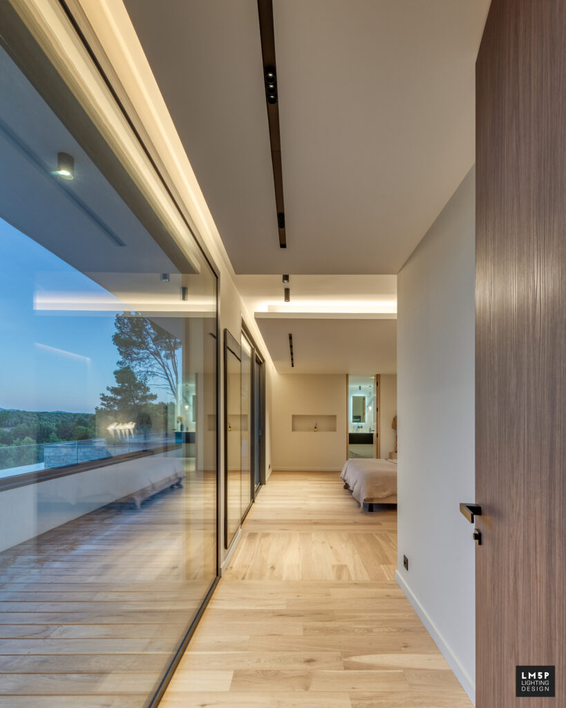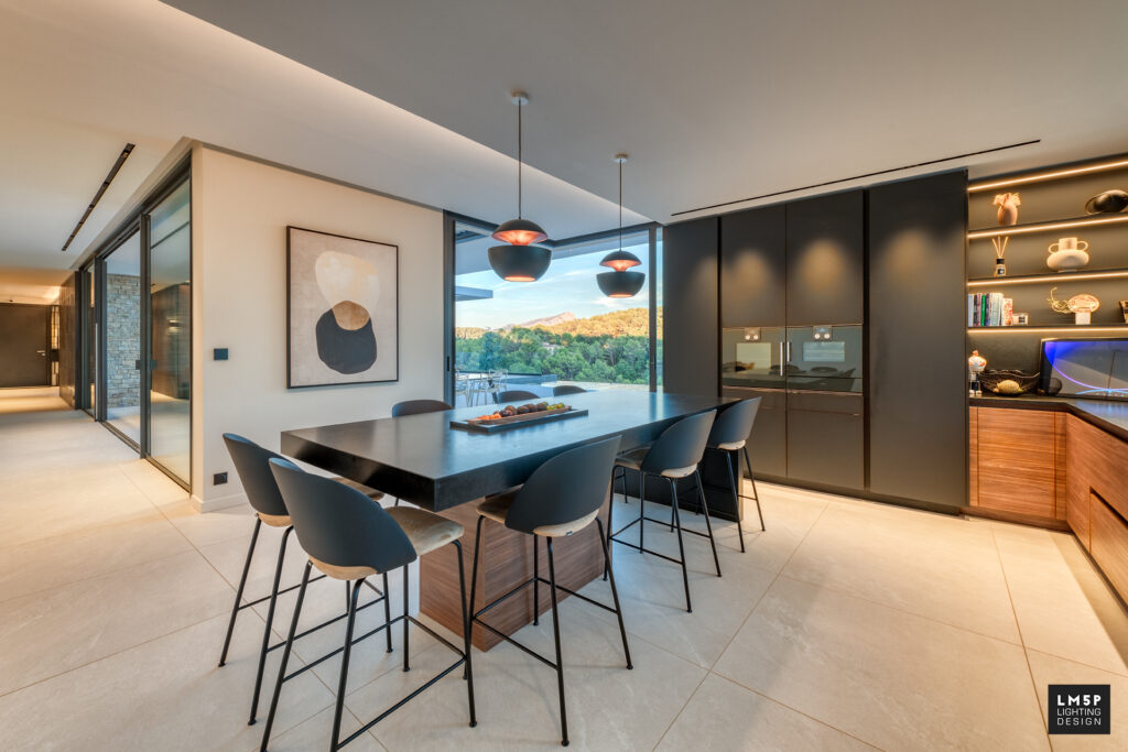 Les très grandes lignes minimalistes encastrées ainsi que les spots et plafonniers rythment notre déambulation dans les pièces et les espaces. Le choix du coloris noir pour ces éléments architecturaux rappelle le code couleur d’autres éléments structurels qui composent la maison tout en contrastant avec les revêtements clairs de la villa. La température LED choisie est chaude (2700K) et l’intégralité des luminaires sont pilotables en variation d’intensité pour accentuer la scénarisation de l’espace.