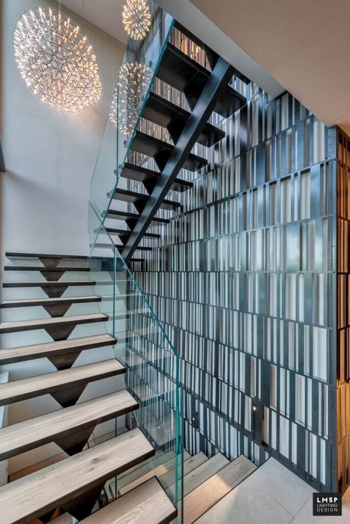 La ligne directrice du projet était de conserver les lignes minimalistes de l’architecture contemporaine de la maison tout en y intégrant de la poésie, de la légèreté et de la chaleur par les suspensions décoratives qui viennent orner les pièces de vie principales.